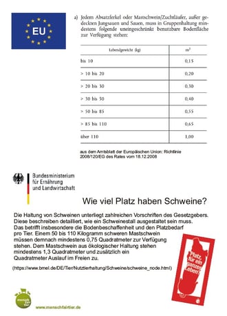 Die Fleischindustrie verdrängt immer mehr die kleinen Betriebe, in riesigen Mast- anlagen werden Tiere fast vollautomatisiert (!) gezüchtet und in immer größer werdenden Megaschlachthöfen in Fleisch verwandelt.